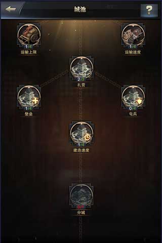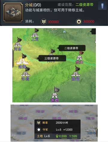 二级资源带属于高级迁城了,需要学问府14级研究相关科技开启分城,但是这个是可以自己选择准确位置,迁城后可获得更大的资源量和存储上限,同样二级资源带土豪居多,竞争激烈,没有一定实力难以力争。而三级资源带需要22的主城和学问府,同时需要武力和统率92以上的武将。