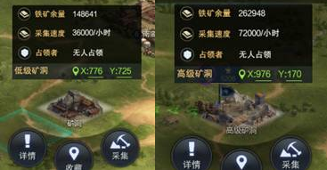 铁矿是本游戏最重要的资源之一,所有建筑升级都需要到,并且征募高阶兵种也需要,属于强中后期都急缺的资源。铁矿在地图上分为低级和高级,采集数量取决于你的部队负重,但是高级采集速度是低级的两倍。铁矿被其他人占领的时候可以选择占领或者掠夺。