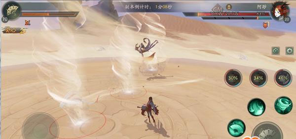 作为土系BOSS,阿渺拥有20万血量,每隔一段时间会召唤蜃气妖,从而协同对玩家进行攻击。但小妖死亡,阿渺攻击力则降低。另外阿渺冲刺技能地上会留下三个龙卷风,在战场上存在长达8秒,在龙卷风内,玩家会被逐渐吸走妖气。因此,首先推荐玩家选择木系妖灵,与阿渺属性相克,输出更高。其次必须先快速清理蜃气妖,才能避免受到阿渺大量伤害,最后尽可能躲避龙卷风,或者携带妖气获取度大的妖灵尽快补充妖气。