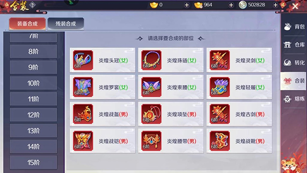 首先大家要知道一点,在游戏里面能够合成的装备只有红色品级的,其他低级品级的装备是无法用来合成的。这类低级装备的处理方式最好是用来熔炼,不仅可以处理掉,还能够提升熔炉的等级带来战力的提升。在红色装备的合成过程中,不同品阶的装备合成技巧是有一定差异的,这个差异就来自于合装装备数量的需求。