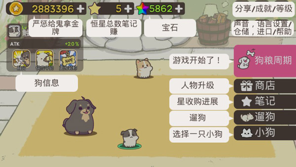 1、温馨舒适的游戏画风,独特有趣的小狗养成玩法;