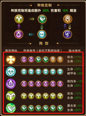 英雄的种族总共分为6种,根据不同种族英雄的布阵会得到不同的阵法属性加成,这里具有有效属性加成的阵法共有16种之多。
