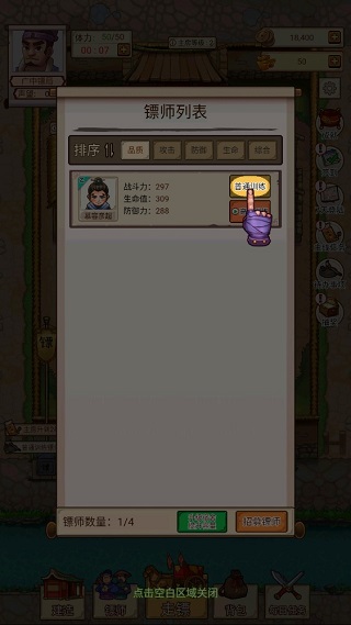 镖师分为甲乙丙丁四个品质等级,不同的技能搭配,通过训练提升镖师属性