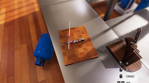 尽管物理效果是游戏体验的一个环节,但却是一个相当令人蛋疼的设计。玩家拿着餐盘很可能因为碰到了冰箱或空气墙导致餐盘被撞碎,食材撒了满地都是。由于游戏中的第一人称看不到自己的手,因此玩家无法做到及时预判,只能通过角色升级或与炉具保持一定的距离来避免这种尴尬的情况。不过游戏物理引擎最逼疯我的是,有时在我将烹饪好的食材放入餐盘时,食材有可能直接穿了餐盘的模型而掉到了地上,最罕见的甚至直接穿了灶台,导致烹饪失败。