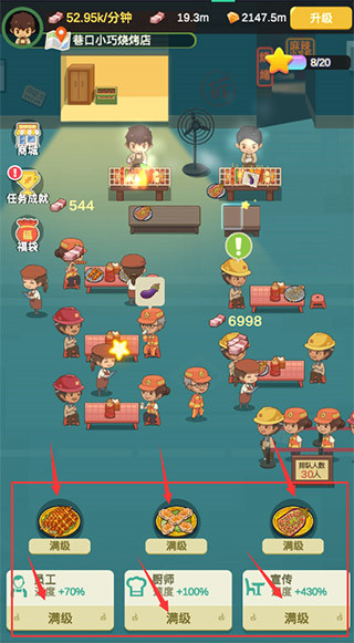 1、简单操作,轻松写意:通过点击升级来获得更多色味俱佳的烤品,升级服务员和厨师的等级,满足食客们的口腹之欲。