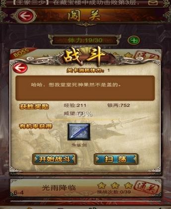装备获取,首先通过“闯关”功能可以获得基本装备(1-2星),然后从“磨练”中的“藏宝楼”副本中获得高质量装备(1-5星)。