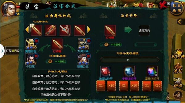 主角和伙伴装备不同的法宝,即可获得不同的属性加成。点击打开“法宝”界面,还能选择四大伙伴进行护法,护法伙伴的品质和等级越高,法宝的属性变化越大,加成效果越显著。装备法宝不仅能提升战力,乾坤圈、芭蕉扇、碧玉琵琶等不同风格的精致外观,也会带来格外绚丽的视觉感受,让你魅力与众不同。