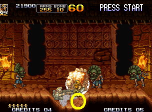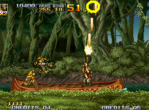 之后在过去一点点会来到一个像----____----的地方,这个地方只要迅速的跳到左上角的地方然后对着右边一直开枪就可以安然无事的渡过。在这边的最后会有一只拿斧头的土人会从左上出来,在这边你只要原地不动一直使用近身攻击(这边一开始就跑去右上角打就可以直接成功,因为右边那只也可以,而且成功率比较高,就可以一直赚分(这个赚分方式...应该是设计者的疏失..我第一天玩就发现了)