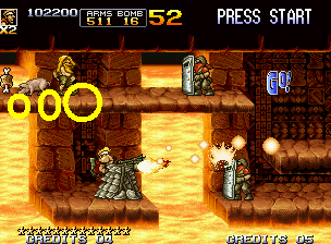 合金弹头5单机版是合金弹头系列游戏推出的第六部作品,游戏很好的延续了系列游戏的整体风格设计,既保留了合金弹头系列中的经典人物角色,在UI上也很好的还原了合金弹头的风格,棕灰色的主色彩格调以及各个选项的点击时的声效都会让曾经的合金弹头玩家感到熟悉。作为经典的横版射击游戏,PLAYMORE接手SNK系列游戏开发后,《拳皇》以 及《合金弹头》等作的FANS们看到了更多的惊喜,而合金弹头5代画面风格没有什么大改变,虽然仍是2D横版过关,但是游戏看的出依旧火爆刺激!讲述为了应付世界上日益加剧的冲突,正规军特殊部队PF队便着手开发新一代的Metal Slug武器。