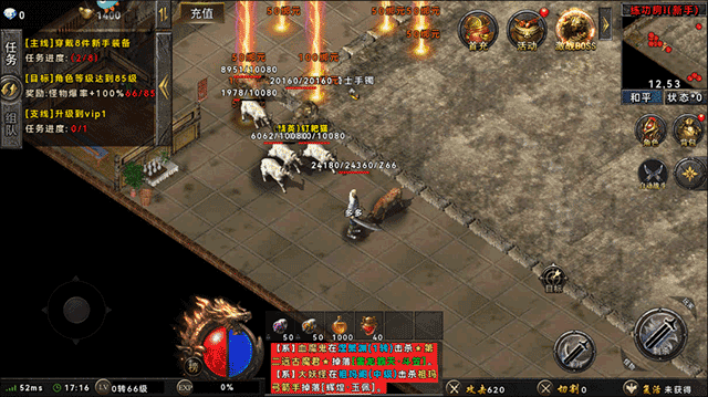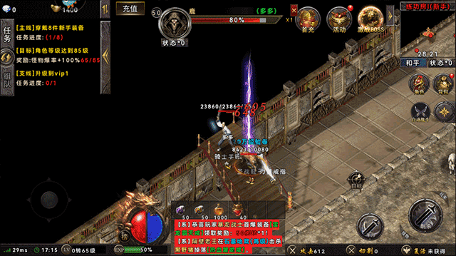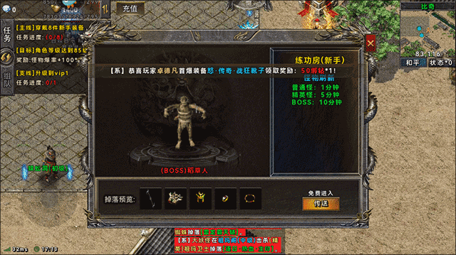 操作教程简单易懂,玩家可以通过任务传送、背包管理等快速上手。装备系统分为普通装备、神装和热血套装,部分装备通过秘境BOSS掉落,提升角色属性。转生系统则需要完成特定等级的任务才能解锁。
