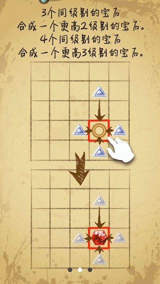 2个同级别的宝石合成1个更高的宝石,3个同级别的宝石合成一个更高2级别的宝石,4个同级别的宝石合成一个更高3级别的宝石。