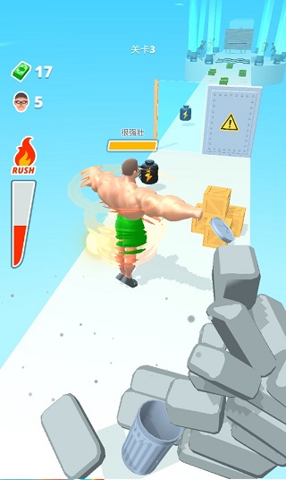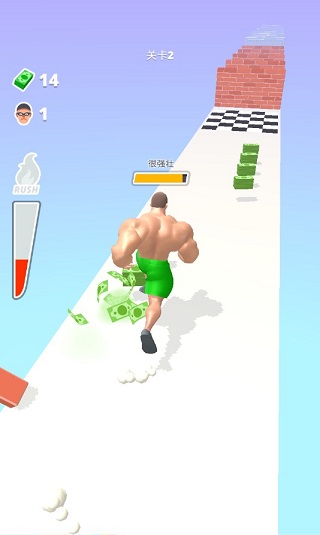游戏里玩家所扮演的角色是个肌肉男,在玩家控制移动的过程中需不断收集赛道上的电池,收集的电池能量越多,他的肌肉力量越大,大到可以打穿多层墙壁,当然了,你也只有打穿了墙壁才能继续在游戏里闯关,拼接一身的蛮力打出更强的实力,挑战更多的关卡。
