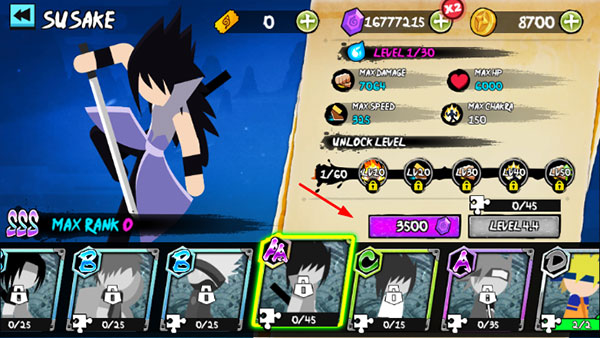 1、用适合的武器击败挡在你面前的所有对手,升级自己的忍者从而获得更强大的力量。