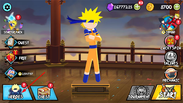 1、首先打开火柴人忍者大战,点击左下角在heroes;