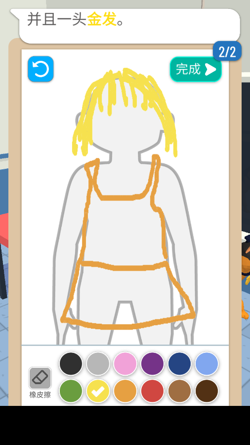 3、下一步是“并且一头金发”,我们需要点击金色,画出头发;