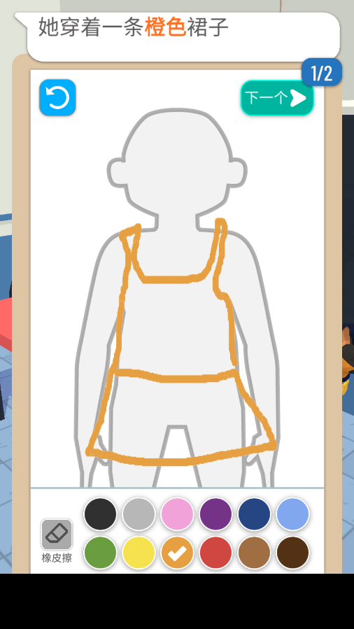 2、接着要根据描述对应画图“她穿着一条橙色裙子”;