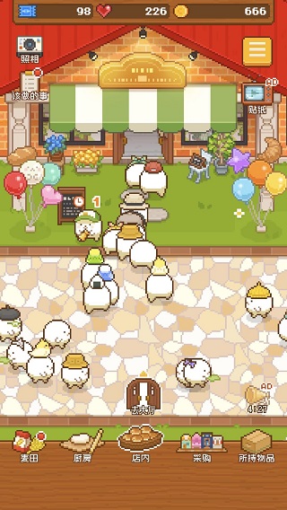 3、店铺里面包摆满的时候可以让小妖精出去搞点酬宾活动(需要看广告),原本冷清的街道会突然出现很多顾客,点它们的小脑袋有机会招进店里,一轮过后基本上店里的面包就被一扫而空了。