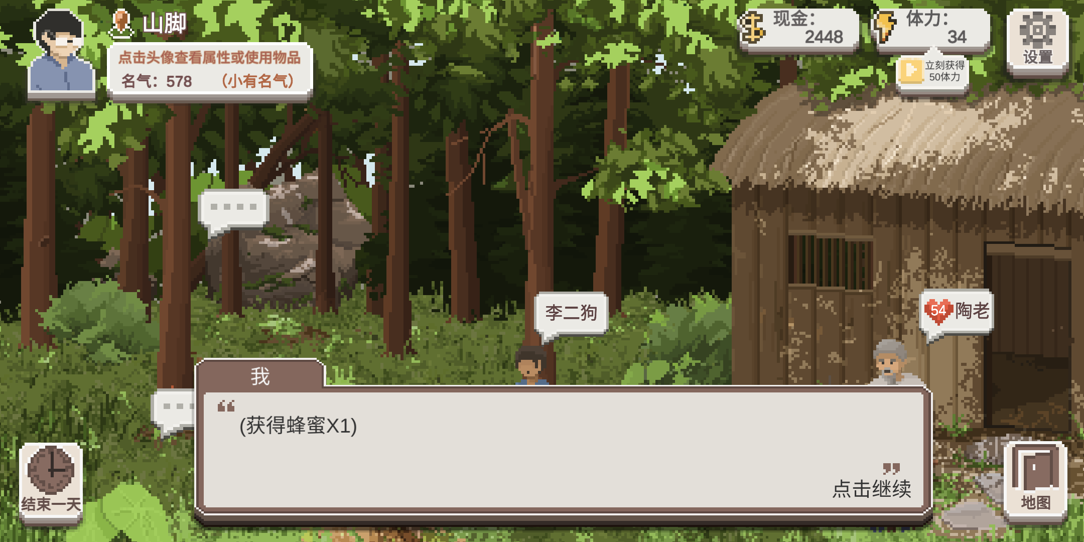 游戏还有收集和成就系统,当达成某种成就后,村民们会送来锦旗,每个锦旗会有不同的加成。
