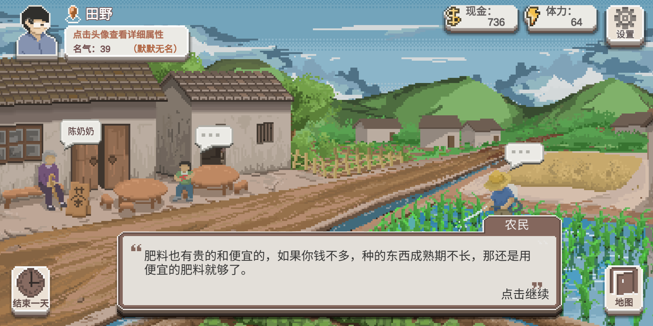 拿赚到的钱去买新田,买种子,然后不断重复即可。另外,二级才可以使用肥料,肥料可以在集市→老八杂货店购买,分别是史丹利200¥/20个和金坷垃400¥/20个,需要注意的是,肥料只能是在种子刚播种下的阶段才可以使用,并且每一个蔬菜位只可以使用一次,加速蔬菜生长速度。