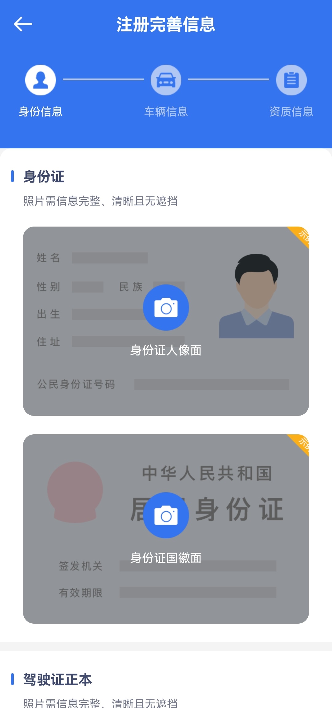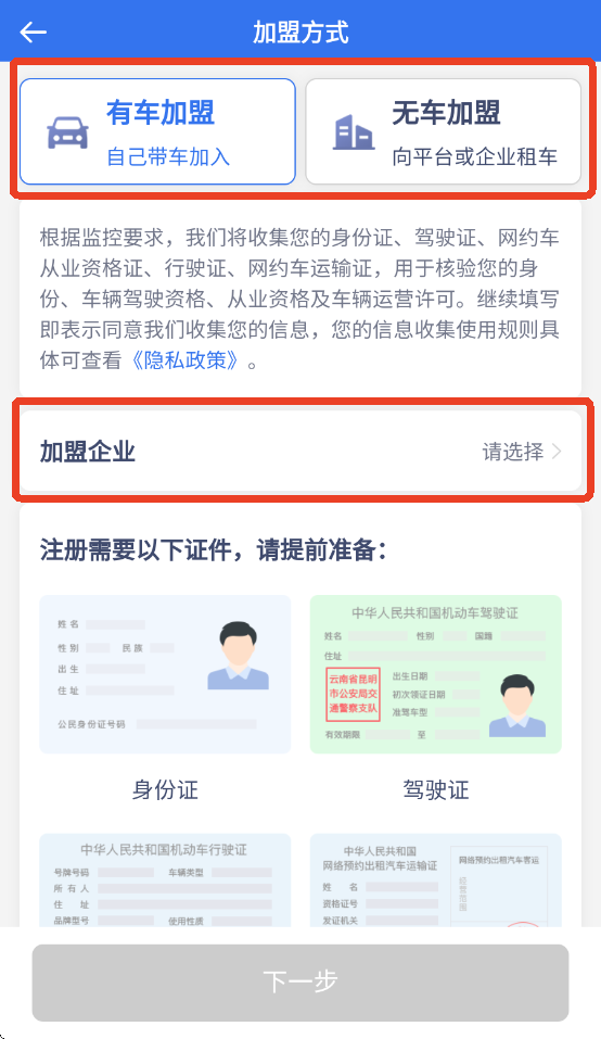 5、可选择有车加盟和无车加盟,有车加盟需要准备身份证、驾驶证、行驶证、网约车运输证、车辆保险信息和人车合照,无车加盟就只需要身份证和驾驶证。选择加盟企业后就可进行下一步。