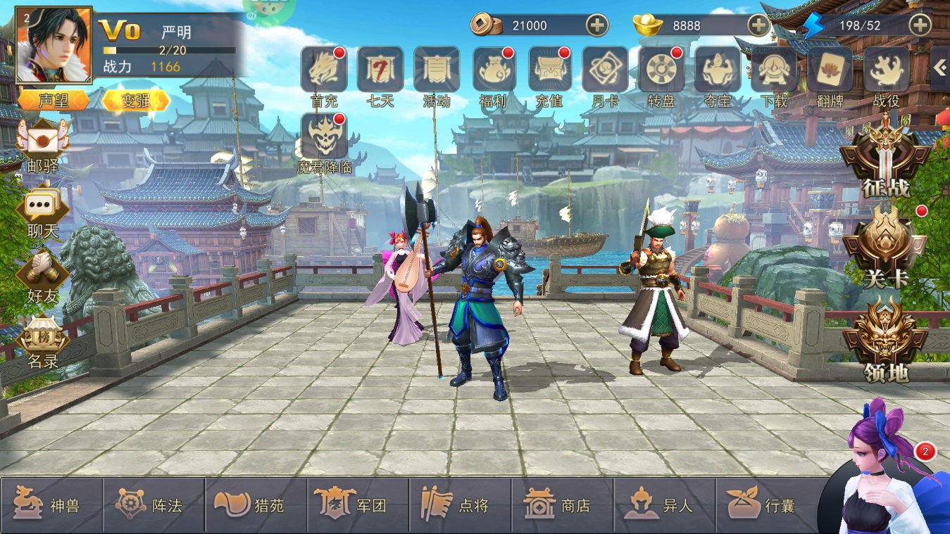 1、开局就是王炸福利,上线即领海量金色元宝,整整 8888 个,首日签到再送十连抽,让你欧气爆棚,五星神将手到擒来!