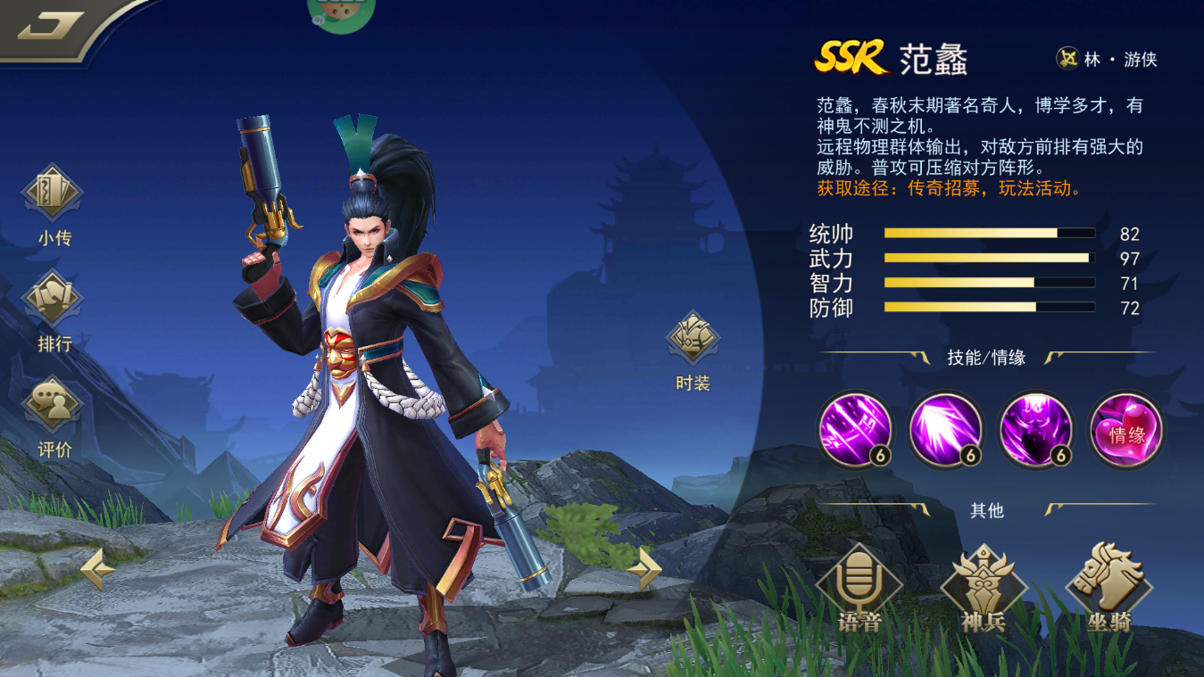范蠡,春秋末期著名奇人,博学多才,有神鬼不测之机。远程物理群体输出,对敌方前排有强大的威胁。普攻可压缩对方阵形。