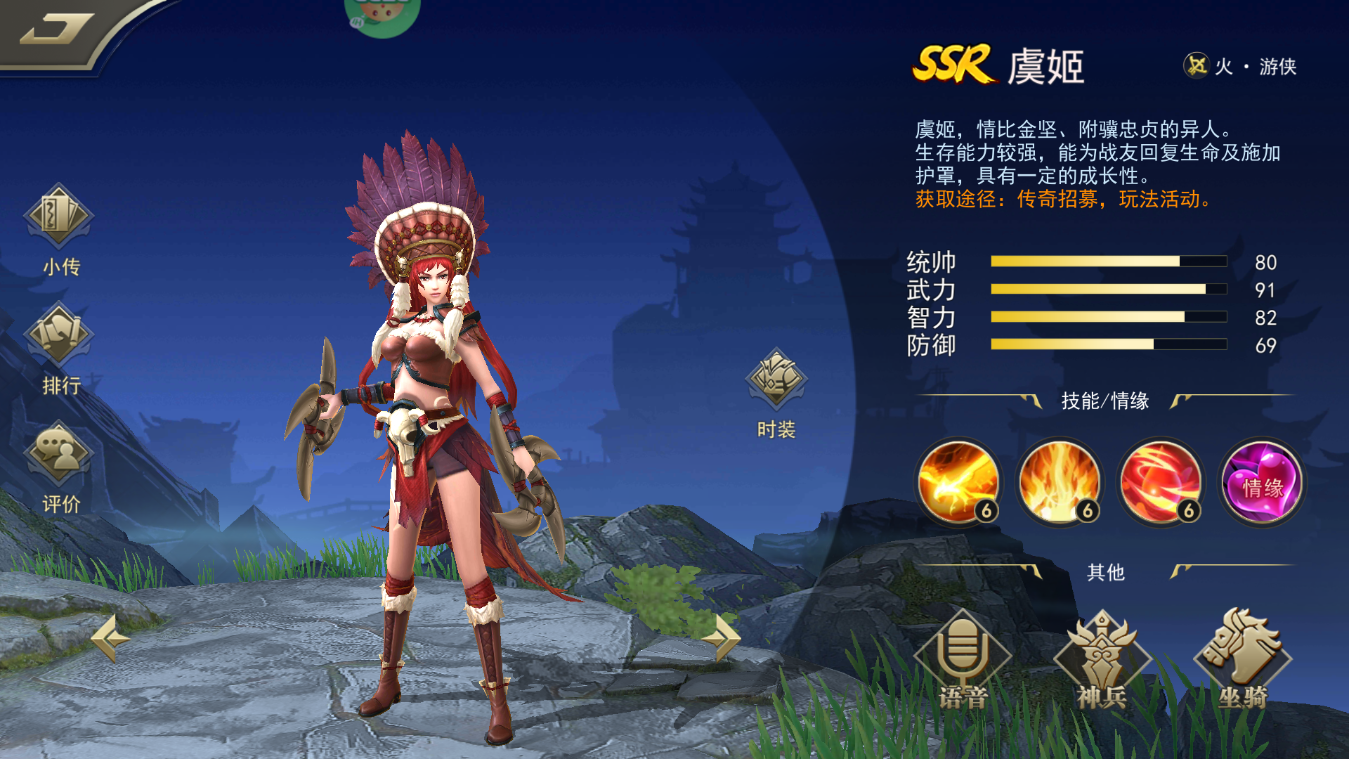 虞姬,情比金坚、附骥忠贞的异人。生存能力较强,能为战友回复生命及施加护罩,具有一定的成长性