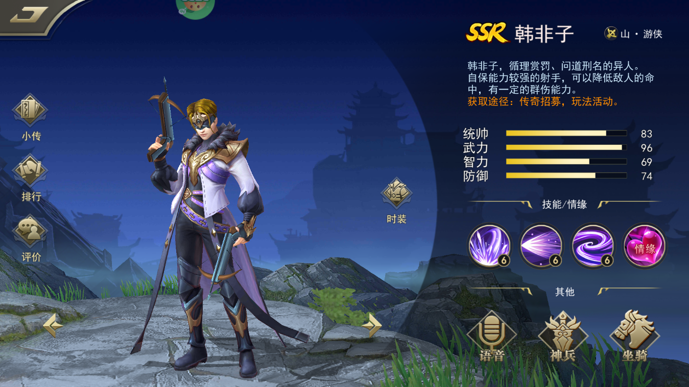 韩非子,循理赏罚、问道刑名的异人。自保能力较强的射手,可以降低敌人的命中,有一定的群伤能力。