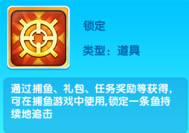 通过捕鱼、礼包、任务奖励等获得可在捕鱼游戏中使用,锁定一条鱼持续地追击
