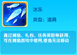 通过捕鱼、礼包、任务奖励等获得可在捕鱼游戏中使用,使鱼无法移动