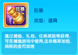 通过捕鱼、礼包、任务奖励等获得可在捕鱼游戏中使用,击杀概率加倍,消耗的金币加倍