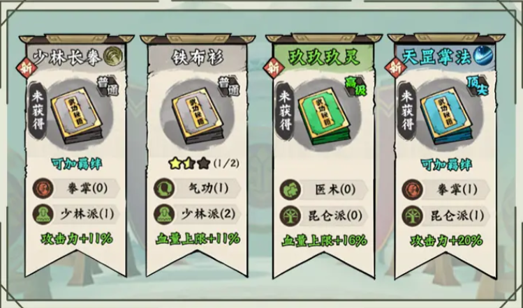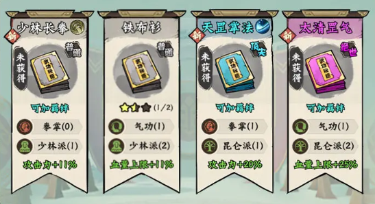 搭配原理:前10关可学习少林长拳,铁布衫,太清掌法太清罡气。20关前优先学习新武功,凑出核心羁绊效果。25关前学习乾坤大挪移,免疫怪物首次攻击之后点出几个2星紫橙色招式,峨眉羁绊加成下输出直接爆炸,再补齐所有羁绊效果。