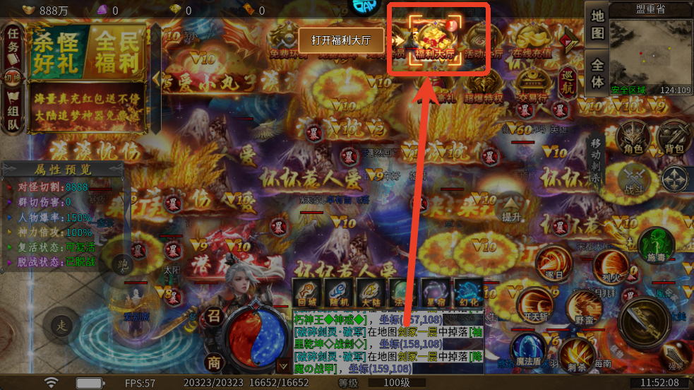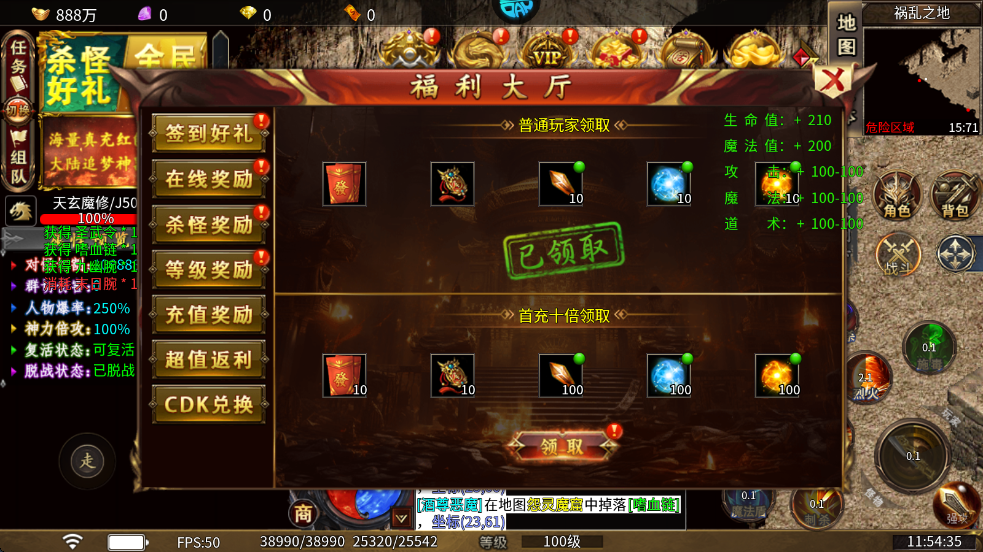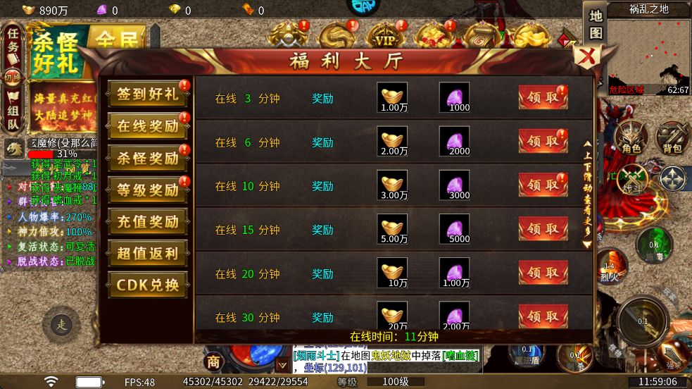 7、在上方的福利大厅可以领取一些基本的奖励,比如在线奖励、等级奖励以及杀怪奖励等等。