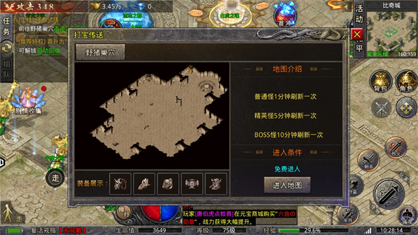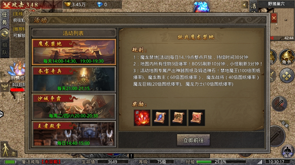 参与活动:参与活动、沙城争霸等活动,与其他服务器玩家竞技。这些活动竞争激烈,但奖励丰厚,可获顶级装备、珍稀道具。在挑战禁地中,展现实力,提升知名度与影响力。