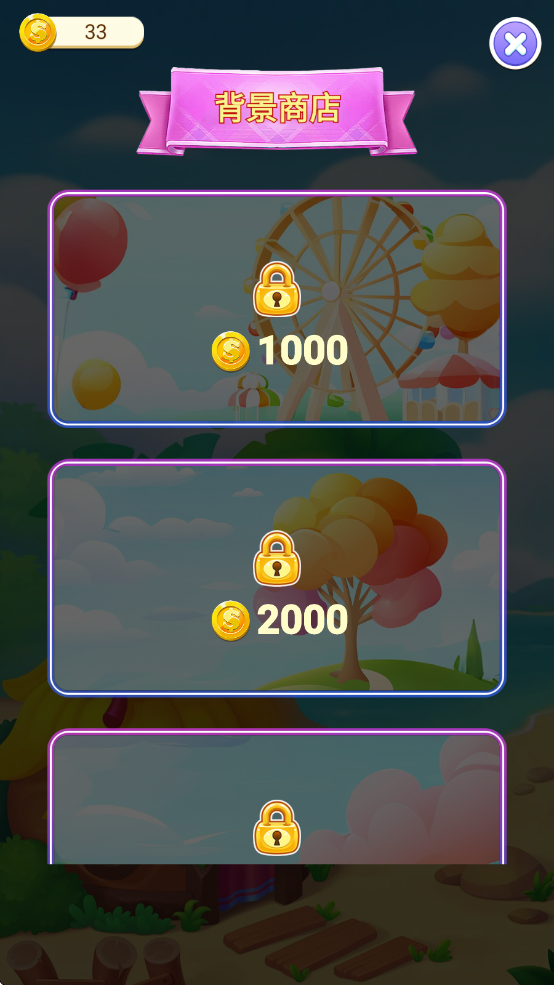 3、游戏中设计了好几个此类风格的背景图片,玩家可以消耗一定金币在商店中购买,然后点击屏幕左上角的重开按键就可以重新开始游戏并更换背景图片。