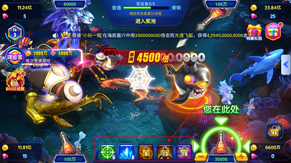 4、在渔场内还有着非常多的BOSS鱼类可以捕捉,获得大量金币、钻石。