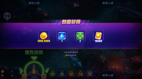 1、玩家进入游戏就可以领取一千万金币和道具奖励,让玩家尽情捕鱼。