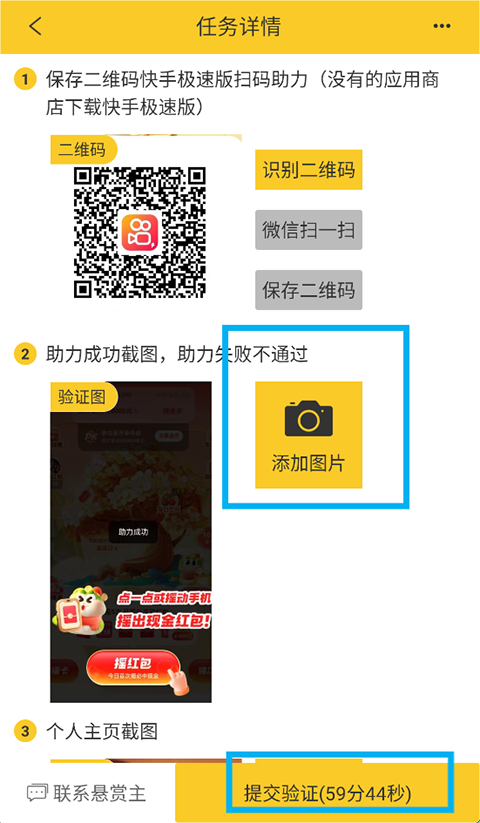 3、报名成功后,在规定时间内按照任务步骤上传截图,提交验证,审核后即可。