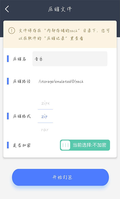 4、填写压缩名、选择压缩类型以及选择是否加密,点击开始打包即可。