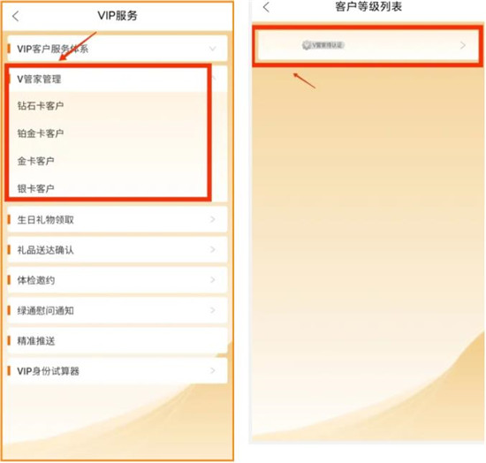 2、打开V管家管理,包含钻石卡、铂金卡、金卡、银卡四类客户,点击相应的菜单可以查看未认证的客户。