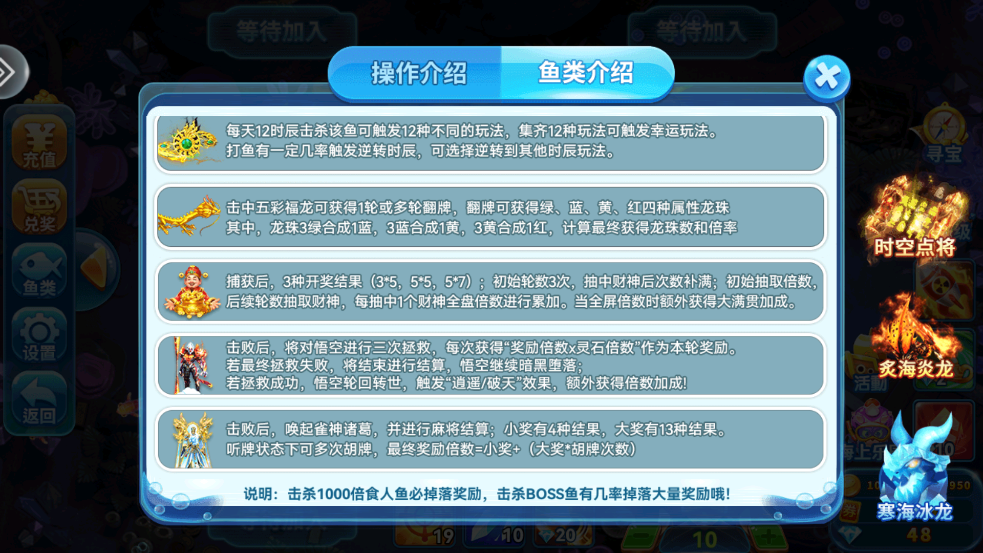 捕获龙王后,根据召唤的深海龙族的倍数之和,可获得相应的奖励=炮台倍数*龙族总倍数,同时击中有可能召唤出龙王,爆出奖池,最高可获得50%的奖池金币。