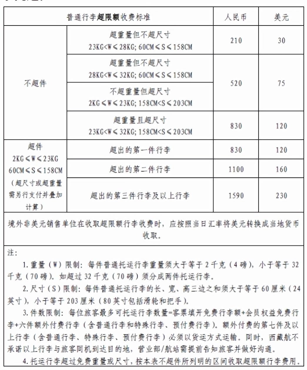 (3)超限额行李费收取境内以人民币为基准货币,境外以美元和欧元(适用于在欧元区的行李托运)为基准货币,若为非美元和欧元销售单位,应按照当日汇率将美元转换成当地货币收取,使用的货币将用于计算整个行程的费用。