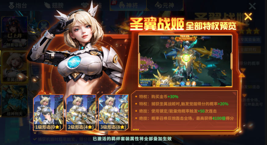 2、特权:捕获圣翼战姬时,触发觉醒得分的概率+20%