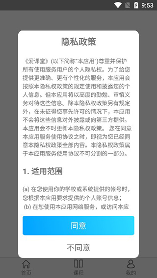 1、下载本站提供的爱课堂学习版app,进入软件后同意用户协议进入主界面。