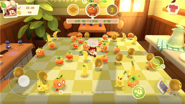 玩家在里面扮演厨师来砍杀小怪,搜集碎片,完成各色可爱的水果食材收集。每个关卡设置一个美味的大Boss进行挑战,选择你的一个战斗武器,用菜刀或者是大勺子等