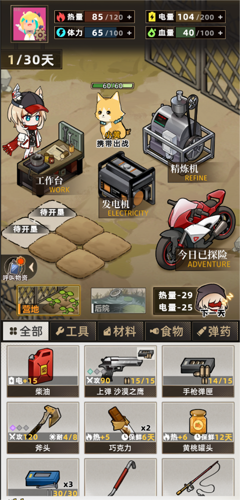 第一天砍树之后用木头和绳子做捕鱼网后摆上,抓鱼,吃到热血再出门,之后前几天优先探索工厂军营加油站或者直接看广告拿燃油,争取在3-5天拿到125体力buff,打不过别硬打,物资拿了可以跑,遇到门可以使用撬棍先开门再尝试暴力拆门。