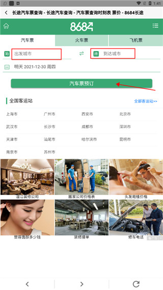 6、进入汽车票输入相关的出发城市与到达城市点击下方的汽车票预定进行查看。