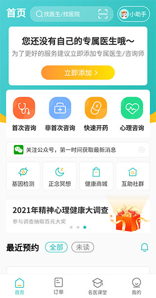 1、首先我们在本站下载安装并打开这款软件,完成注册登录的操作后会来到首页,这里为我们展示的是心理咨询和快速开药服务,点击下方的基因检测、正念冥想、健康商城和互助社群按钮也会跳转至相应的小程序中完成进一步操作,下方也有显示最近预约的提醒。