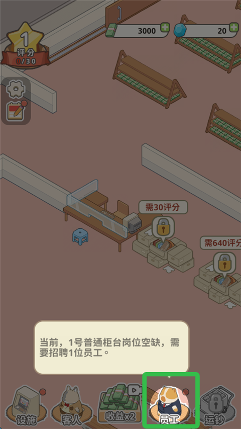 动物钱庄是一款可爱风经营模拟游戏,作为橡果钱庄分行新任命的管理者,玩家需要速速上岗,熟悉钱庄各方业务,将钱庄打造为动物城排行第一的钱庄。当钱庄人手不够时,玩家需要招聘合适的人才,而不同资质的人才可以为柜台业务增加的利润不同,因此玩家需要尽量招聘sss资质人才,让柜台业务利润大幅度提升。