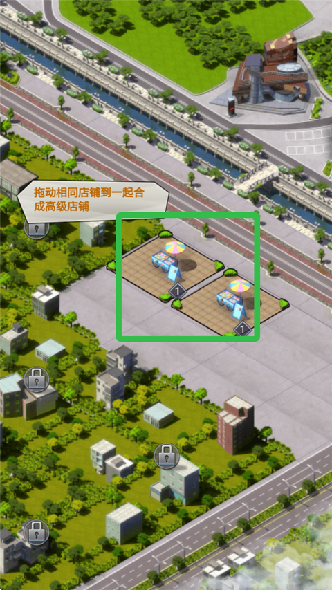3、拖动两个相同店铺到一起合成高级店铺。